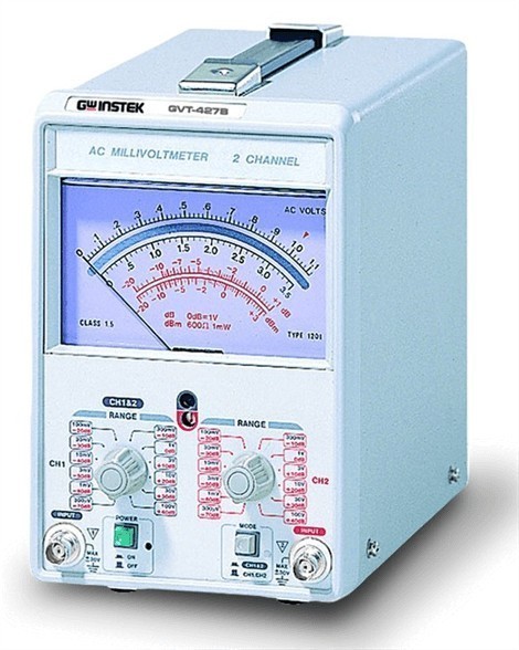 Вольтметр переменного тока GVT-427B: 2 канала измерения; Измерение среднеквадратического значения переменного напряжения синусоидальной формы на пределах от 300 мкВ до 100 В; Диапазон рабочих частот 10 Гц … 1 МГц; Измерение относительных уровней на пределах от минус 70 дБ до 40 дБ